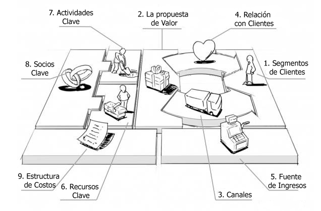 El modelo Canvas está estructurado en nueve bloques partiendo de la propuesta de valor o del mercado que se quiere atender se va complentando de manera secuencial
