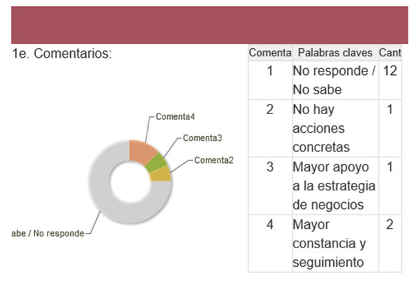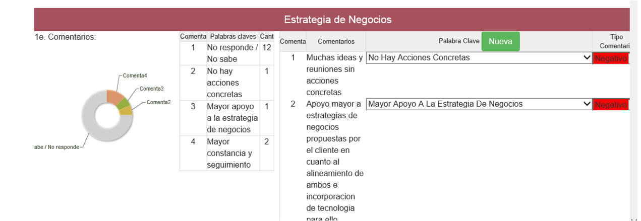 Partiendo de los comentarios o respuestas abiertas que se recopilan durante la ejecución, se registran y asignan un insight que represente el mensaje clave de cada comentario de cada pregunta